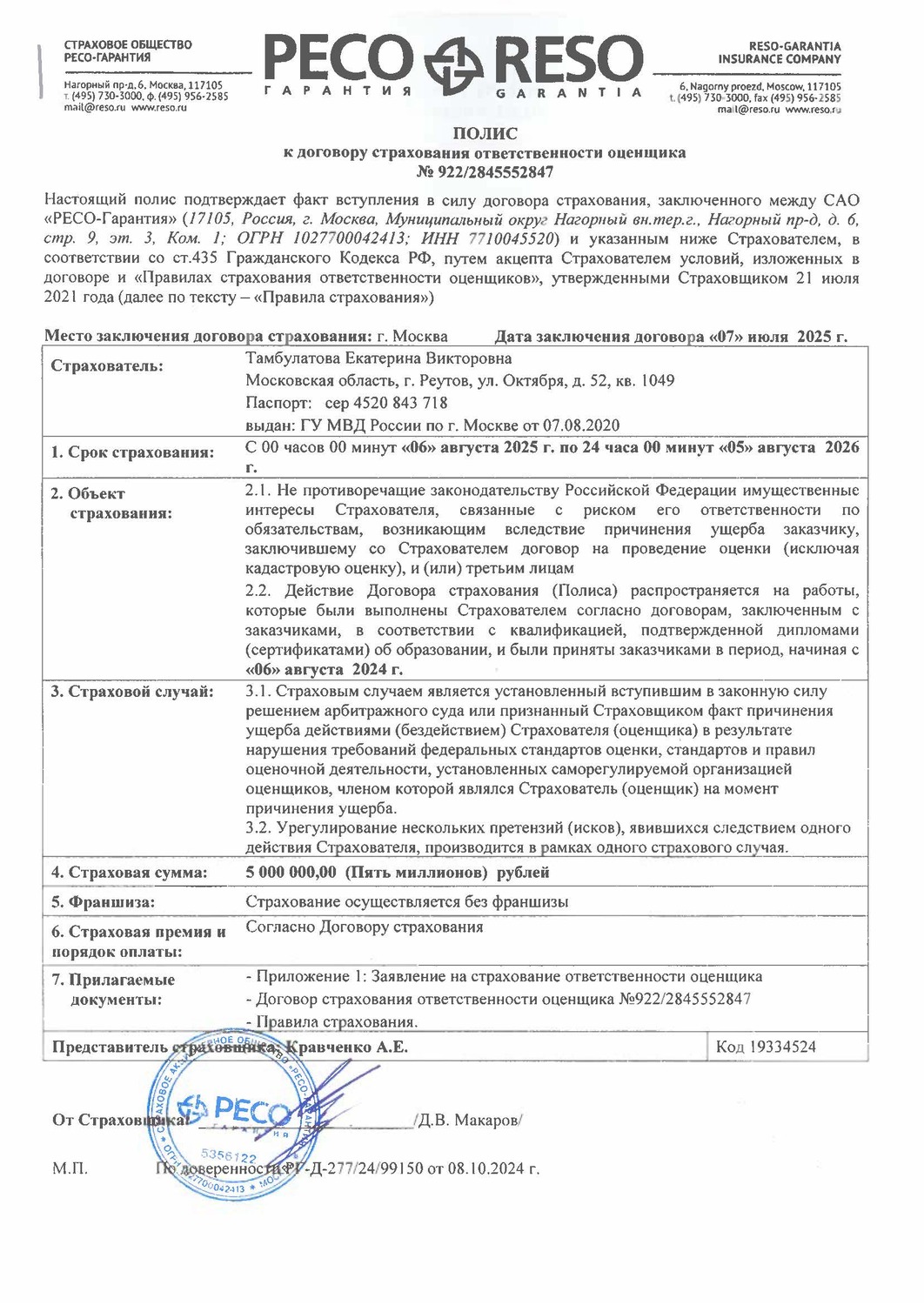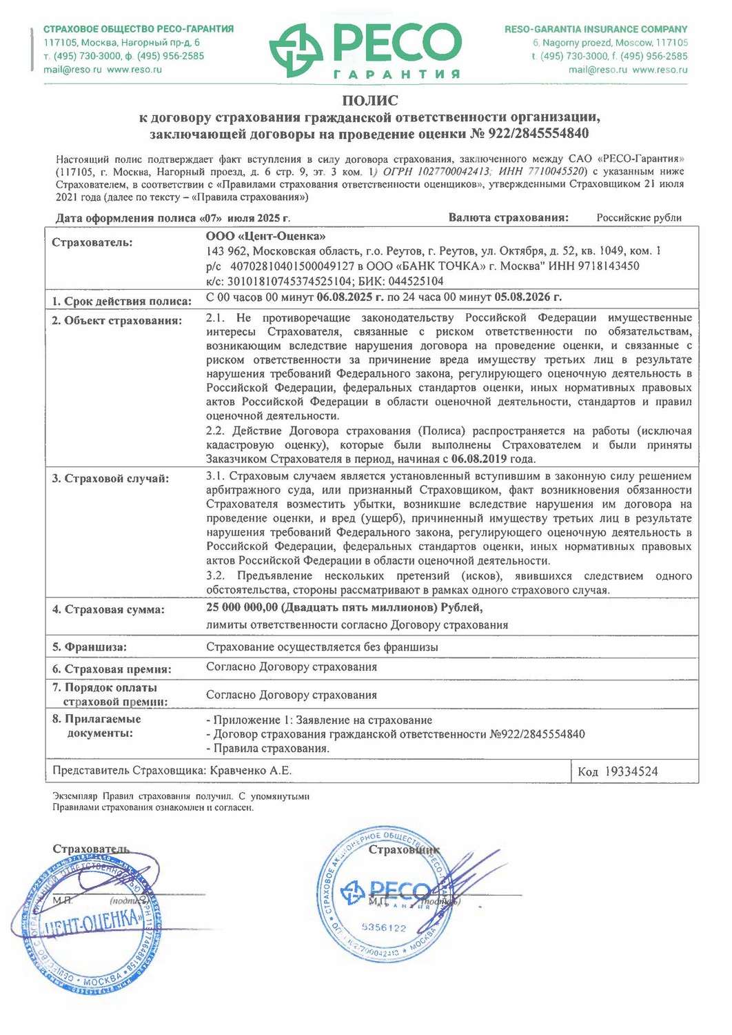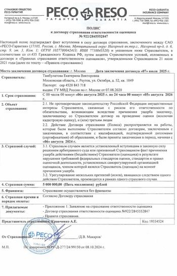 Сведения об оценщике: Диплом, Свидетельство о членстве в СРО, Выписка из реестра СРО, Полис обязательного страхования ответственности оценщика
